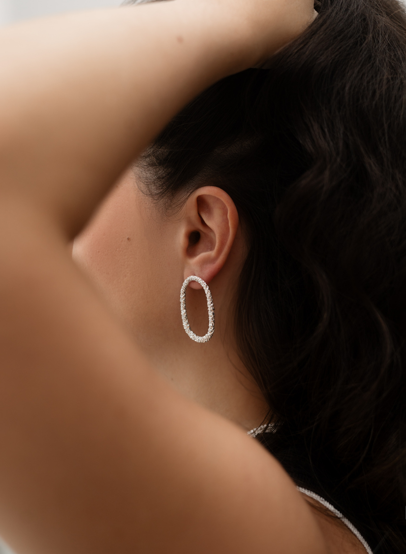 Este brinco deslumbrante apresenta uma formato oval cravejada de zircônia, proporcionando um brilho sofisticado e encatador.